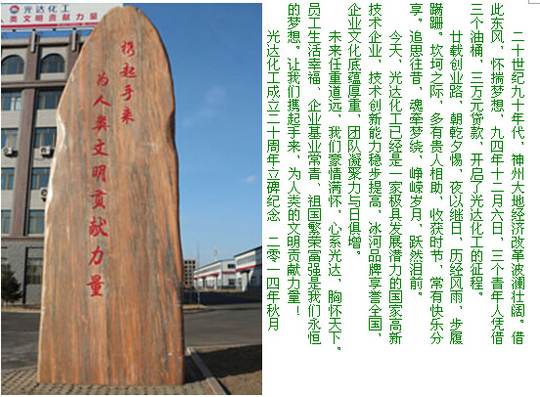 夜以繼日、屢經(jīng)風(fēng)雨,經(jīng)歷了埋頭苦干的默默創(chuàng)業(yè)期,2014年正值企業(yè)創(chuàng)業(yè)20周年之際,已經(jīng)有了科技硬實(shí)力和文化軟實(shí)力的光達(dá)企業(yè),把“攜起手來,為人類文明貢獻(xiàn)力量!”的企業(yè)核心價(jià)值深深地鐫刻在門前高大的碑石上,宣言般昭示著企業(yè)的信仰和發(fā)展奮斗的方向,也時(shí)刻警醒和激勵(lì)著這里的每個(gè)員工。