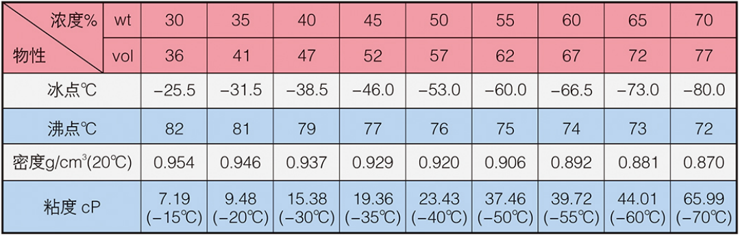 LM-1型冰河冷媒由一元醇改性構(gòu)成,主要添加劑包括防腐蝕劑,防霉劑,增溶劑等。外觀為淺色液體。20℃時,原液密度為0.850~0.860g/cm°,粘度為1.25mPa·s(cP),比熱為0.603ca/g:℃熱導(dǎo)率為0.26W/m·K。沸點高于60℃,冰點低于-100℃,閃點為16℃。