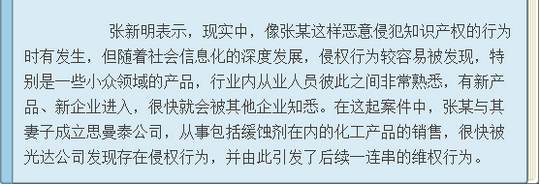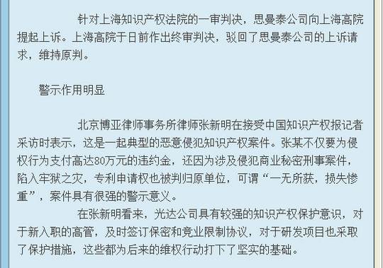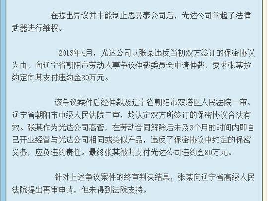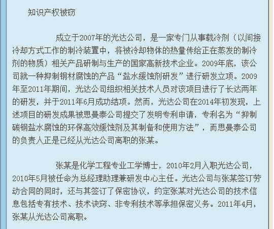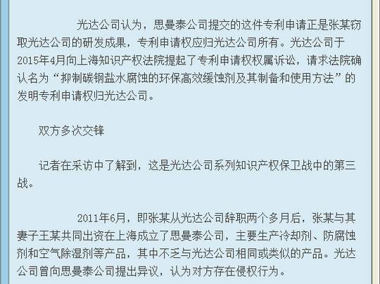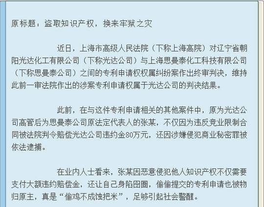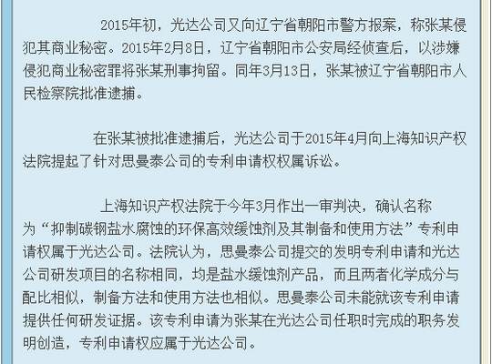 近日,上海市高級(jí)人民法院(下稱上海高院)對(duì)遼寧省朝陽光達(dá)化工有限公司(下稱光達(dá)公司)與上海思曼泰化工科技有限公司(下稱思曼泰公司)之間的專利申請權(quán)權(quán)屬糾紛案作出終審判決,維持此前一審法院作出的涉案專利申請權(quán)屬于光達(dá)公司的判決結(jié)果。在與這件專利申請相關(guān)的其他案件中,原為光達(dá)公司高管后為思曼泰公司原法定代表人的張某,不僅因?yàn)檫`反競業(yè)限制合同被法院判令其賠償光達(dá)公司違約金80萬元,還因涉嫌侵犯商業(yè)秘密罪被依法逮捕。光達(dá)公司不認(rèn)可法院判決,又在遼寧省朝陽市雙塔區(qū)人民法院進(jìn)行上訴,在2017年8月30日開庭,判決結(jié)果如下:
