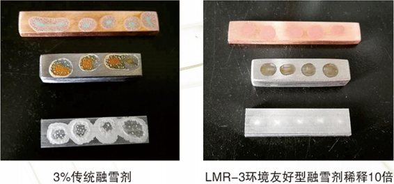 3、防腐蝕性能好,采用M3超膜防銹技術(shù),對(duì)碳鋼、銅、鋁合金等金屬幾乎不腐蝕;對(duì)瀝青、混凝土路面腐蝕小。LMR-3融雪劑防銹性能見下圖。