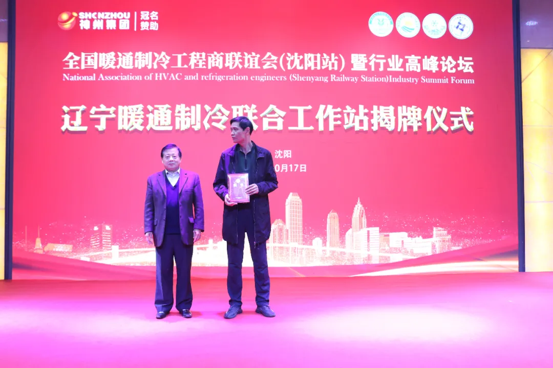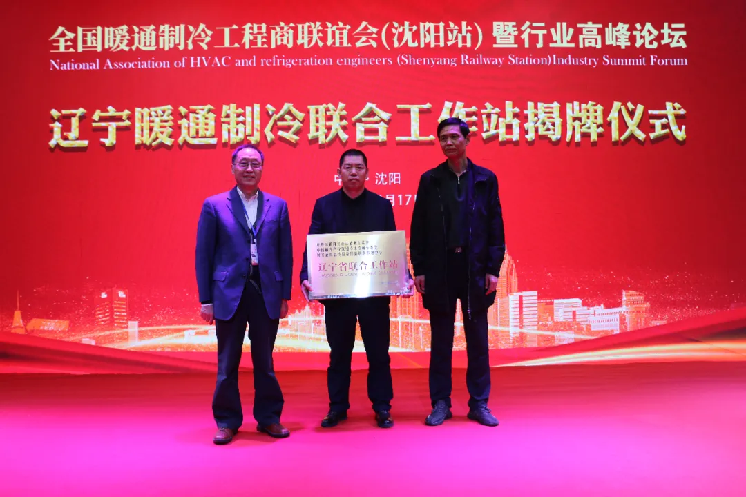 黃建忠司長(zhǎng)和吳建國(guó)理事長(zhǎng)為遼寧暖通制冷聯(lián)合工作站揭牌,并由工作站站長(zhǎng)于文濤接牌。