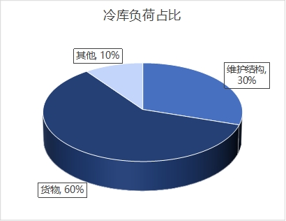 首先我們需要了解冷庫的負荷組成,冷庫負荷主要包括圍護結(jié)構(gòu)負荷,進貨貨物負荷(不超過庫容量的10%),照明、設(shè)備、人員操作負荷。其中維護結(jié)構(gòu)的負荷占比達20~30%,貨物負荷占比60%左右,其他占10%。