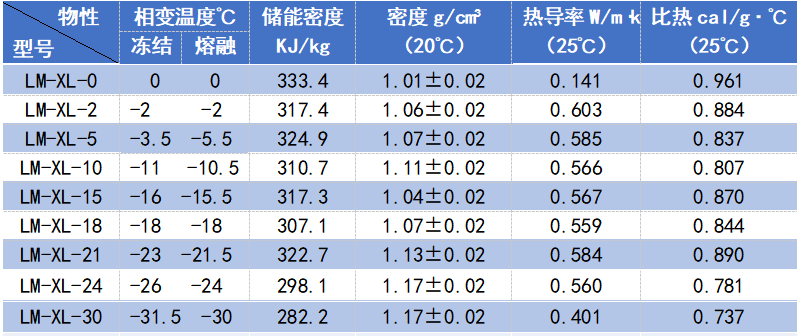 LM-XL系列產(chǎn)品由主儲(chǔ)能劑、相變調(diào)整劑、防過冷劑、防相分離劑、誘發(fā)劑等多組分復(fù)合制備而成。本品通過液-固-液相態(tài)變化實(shí)現(xiàn)冷能的儲(chǔ)存和釋放,具有較高的儲(chǔ)能密度及合適的比熱和導(dǎo)熱系數(shù)。本品不易揮發(fā)、安全可靠,可以反復(fù)使用。